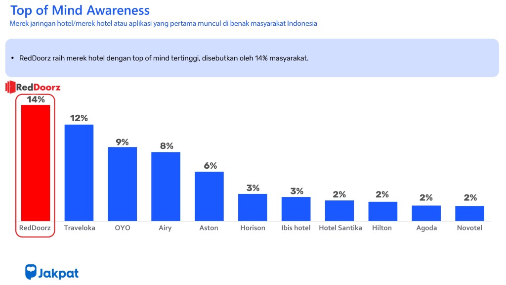 Melihat dari data konsumen yang dirilis oleh Jakpat yang merupakan salah lembaga riset pemasaran terbesar yang berbasis di Indonesia, RedDoorz menjadi merek hotel yang paling diingat di tengah persaingan segmen travel di Indonesia yang sangat ketat. Brand awareness dari RedDoorz meningkat secara konsisten sepanjang tahun dan mencapai puncak daftar top-of-mind awareness tertinggi di November 2019, menandakan bahwa semakin banyak masyarakat Indonesia yang mengingat RedDoorz sebagai merek hotel nomor satu di Indonesia.
