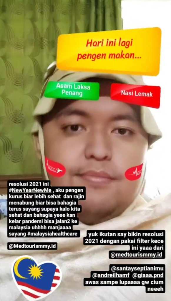 Ya bener banget sesuai pembahasan sebelumnya, Medical Tourism Malaysia menantang kita semua untuk berani dan berkomitmen untuk membuat resolusi baru di tahun yang baru ini menggunakan filter instagram khusus yang sudah disediakan oleh Medical Tourism Malaysia di instagramnya @medtourismmy.id dengan tema “New Year, New Me, New Hope”.