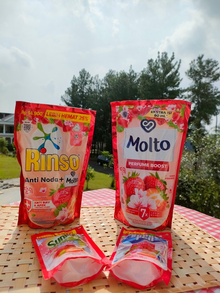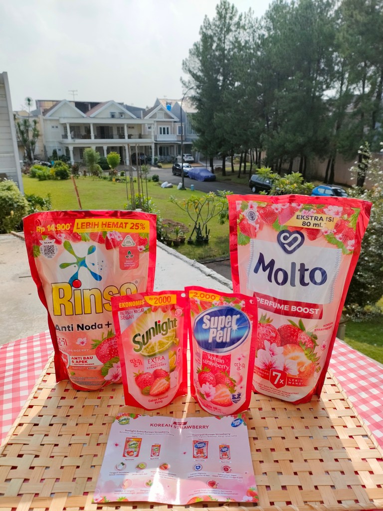 Kemudian ada Sunlight Extra Korean Strawberry yang bikin piring bersih kesat dengan kesegaran strawberry dan ada juga Rinso Korean Strawberry powder 700 gram yang menghilangkan noda dengan sekali kucek dengan wangi Moltonya yang tahan hingga 21 hari dan efektif membunuh bakteri dan virus hingga 99.99%. uhhhh mantab ya kan bebs…